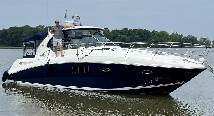 Just listed! Striking dark blue hull cruiser powered by twin MerCruiser 8.1S Horizons, featuring Kohler generator, A/C, full canvas enclosure, advanced Garmin & Raymarine electronics, full galley, and comfortable two-cabin layout. $150,000 S&J Yachts, 410.571.3605 www.sjyachts.com