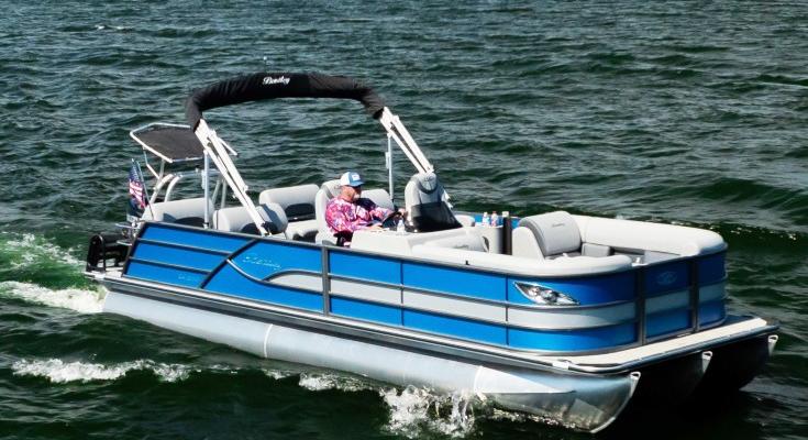 AVAILABLE FOR VIEWING AT SOUTH RIVER MARINA, EDGEWATER, MD & SUPERSTORE DAGSBORO, DE. New triple-pontoon, Yamaha engine. 4-swingback benches, sage/blue panels, gray interior, double-Bimini, Ski locker/towbar. (Stock# BP-169) Rudy Marine, 302.945.2254, www.RudyMarine.com
