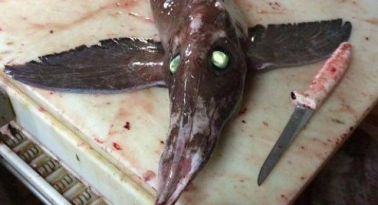 Early in March, a fishing trawler off the coast of Newfoundland caught a very mysterious fish with a long pointy snout, bright green eyes, and ribbed fins that almost resemble bird wings.