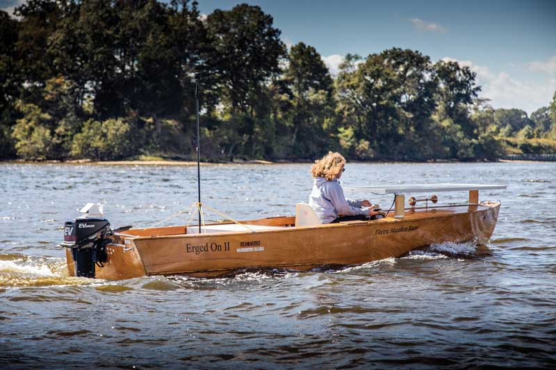 The Wye Island Challenge is also a race, however. Over the years, there have been some entrants whose objective is not just quiet passage through nice scenery. Paul started the quest for speed when he set a record with a multihull coach boat. Jim Campbell ran a lot of years in his eCanoe, each year until 2019 faster than his prior one. Jim’s eCanoe set numerous single-hull lead acid battery records. PropTalk’s 58-foot Electrashell was perhaps the craziest: a converted eight-oar shell, which held the overall record briefly until eclipsed by Ned Farinholt’s 19-foot Erged On II.
