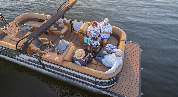 AT BAY BRIDGE BOAT SHOW APR 17-19, GRANSONVILLE, MD. New triple-pontoon, Yamaha F350 DEC engine. Tower w/wet tunes, charcoal/green panels, brandy interior, Bimini, Ski-Locker & towbar. (Stock# BP-172) Rudy Marine 302.945.2254 www.RudyMarine.com