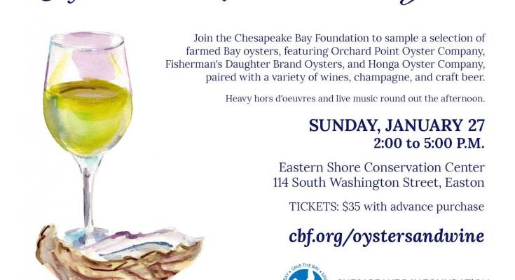 Enjoy Maryland-farmed oysters, wine, champagne, and beer at the Chesapeake Bay Foundation's second annual Oysters and Wine on the Eastern Shore January 27.