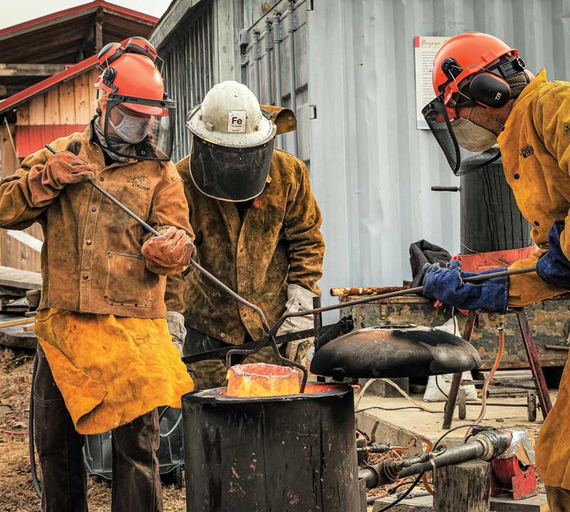“Already, garboard strakes have been installed and the ship’s hull has been lined out for exterior planking. These planks are spiled for shape, steamed to fit, and finally fastened to the hull with treenails. Planks below the waterline are made from angelique and those above are white oak. The deck framing crew has completed all of Maryland Dove’s new deck beams and is now working on carlins, stanchions, hanging knees, lodging knees, and deck houses to complete the structure for planking. The rigging crew, meanwhile, is 90 percent done with the ship’s spars and has moved onto fabricating blocks. Next up for them will be the standing rig, while the sails have now been finished by Traditional Rigging Inc. in Maine. CBMM’s shipwright apprentices have also been participating in the build by helping to fabricate bronze clench rings while learning the ropes of green sand metal casting. To learn more about the project, visit marylanddove.org.”