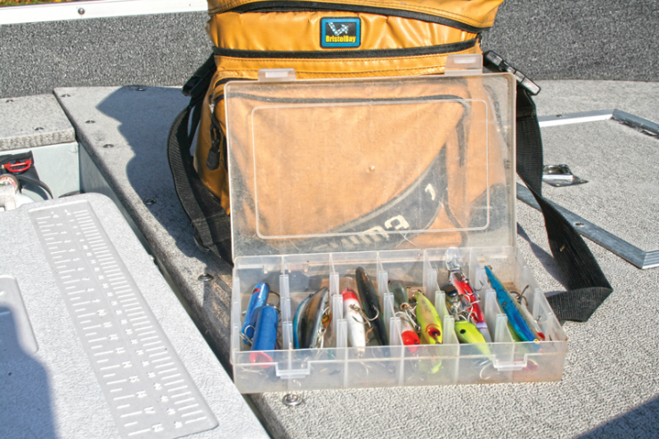 I can switch out the various plastic tackle boxes to match the type of fishing I will be doing on any given trip. I have boxes of plugs, metal lures, bucktails, and D.O.A. lures. One plastic box that is always in my bag contains a wide variety of hooks, swivels and snaps. The large pocket in the front of the bag holds several different types of mono lines, so I can make up any type of leader or rig in short order.