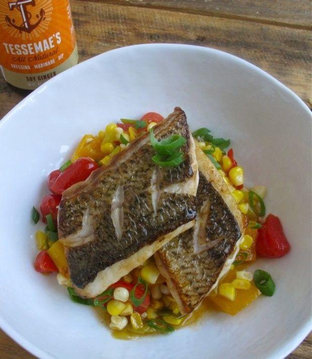 What you need 4 ears corn, shucked 2 orange bell peppers, cut into 1 inch pieces 1 pint grape tomatoes, halved 2 garlic cloves, thinly sliced 1 bunch scallions, thinly sliced 3/4 cup Tessemae’s Soy Ginger Dressing (or similar marinade) 8 rockfish fillets (about 3 ounces each) What to do Heat your grill to medium high. Stand the corn on end and scrape off the kernels using a sharp knife. Prepare the rockfish by lightly scoring the skin with a chef’s knife. (This will prevent it from curling up when it sears.) Place on plate with a layer of paper towel on bottom and on top to absorb excess moisture.